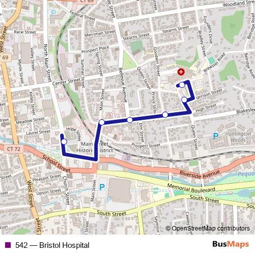 The first stop of the 542 bus route is Brewster Rd @ Bristol Hospital and the last stop is North Main St @ Hope St. 542 (Bristol Hospital) is operational during everyday.