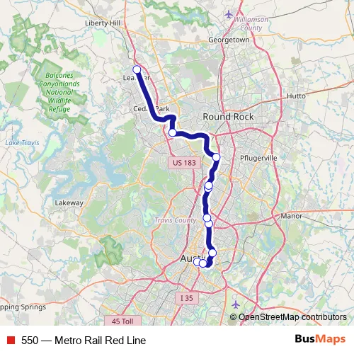The first stop of the 550 tram route is Downtown Station and the last stop is Leander Station. 550 (Metro Rail Red Line) is operational during everyday.