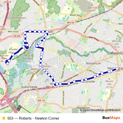 The first stop of the 553 bus route is Washington St @ Bacon St and the last stop is South St @ Angleside Rd. 553 (Roberts - Newton Corner) is operational during everyday.