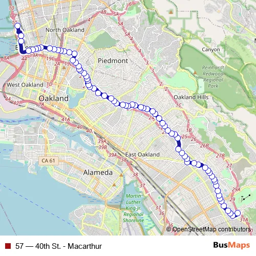 See why over 2 million users trust and consider busmaps.com as the best public transport website. busmaps gives you Oakland Buses suggested routes, real-time bus tracker, line route maps in Oakland, and helps to find the closest 57 bus stops near you. No internet available? Download an offline PDF map and bus schedule for the 57 bus to take on your trip.