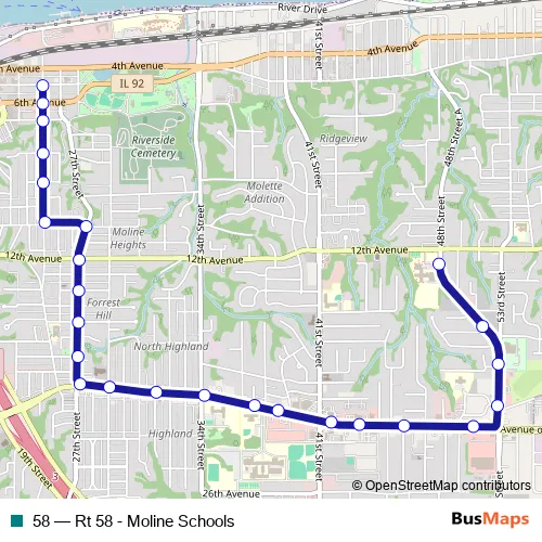 The first stop of the 58 bus route is Wilson Middle School and the last stop is 25 St & 5 Ave. 58 (Rt 58 - Moline Schools) is operational during on weekdays.