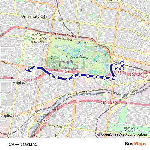 The first stop of the 59 bus route is Highland Terrace @ Richmond Center Sb and the last stop is Central West END Transit Center. 59 (Oakland) is operational during everyday.