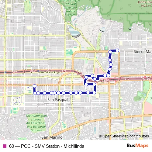 The first stop of the 60 bus route is Sierra Madre Blvd & Michillinda Ave and the last stop is Bonnie Ave & Colorado Blvd. 60 (PCC - SMV Station - Michillinda) is operational during on weekdays.