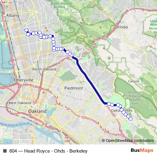 The first stop of the 604 bus route is 5500 Redwood Rd & Hebrew Day School and the last stop is North Berkeley Bart. 604 (Head Royce - Ohds - Berkeley) is operational during on weekdays.