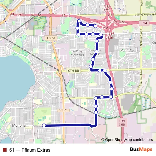 The first stop of the 61 bus route is N Thompson at Kurt and the last stop is Pflaum at Lafollette High. 61 (Pflaum Extras) is operational during on weekdays.