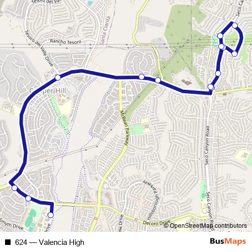 The first stop of the 624 bus route is Seco Canyon Rd & Copper Hill Dr and the last stop is Nth Dickason Dr & Decoro Dr. 624 (Valencia High) is operational during on weekdays.