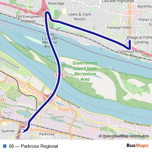 The first stop of the 65 bus route is Parkrose/Sumner Transit Center and the last stop is Fisher's Landing Transit Center: Bay C. 65 (Parkrose Regional) is operational during everyday.