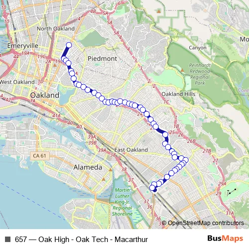 See why over 2 million users trust and consider busmaps.com as the best public transport website. busmaps gives you Oakland Buses suggested routes, real-time bus tracker, line route maps in Oakland, and helps to find the closest 657 bus stops near you. No internet available? Download an offline PDF map and bus schedule for the 657 bus to take on your trip.