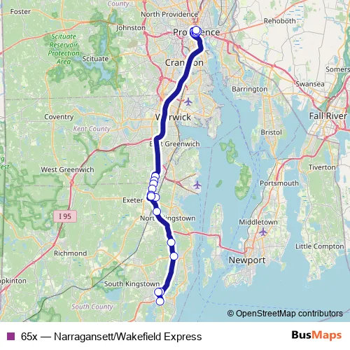 The first stop of the 65x bus route is Rhode Island Convention Center (Sabin) and the last stop is Narragansett (Salt Pond Plaza) at Stop & Shop. 65x (Narragansett/Wakefield Express) is operational during on weekdays.