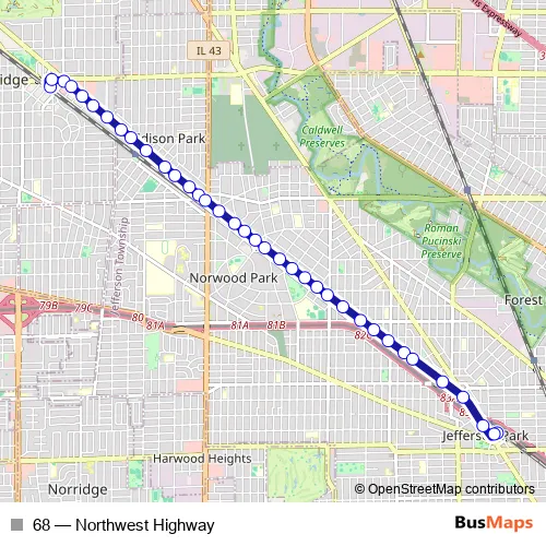 The first stop of the 68 bus route is Summit & Prospect and the last stop is Jefferson Park Transit Center. 68 (Northwest Highway) is operational during everyday.