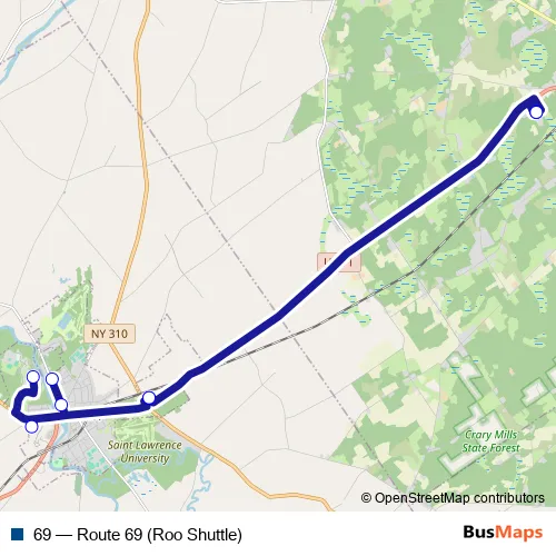 The first stop of the 69 bus route is Walmart - Potsdam Ib and the last stop is Walmart - Potsdam Ib. 69 (Route 69 (Roo Shuttle)) is operational during on weekdays.