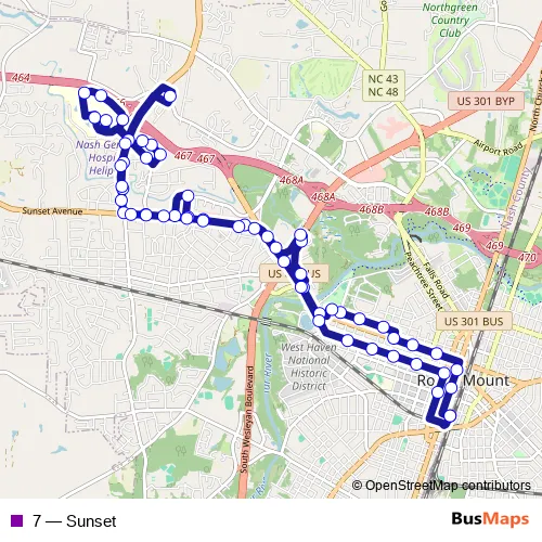 The first stop of the 7 bus route is Downtown Transfer Center and the last stop is Downtown Transfer Center. 7 (Sunset) is operational during everyday.