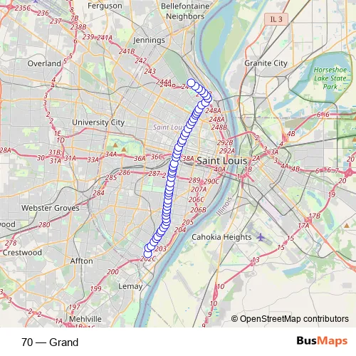See why over 2 million users trust and consider busmaps.com as the best public transport website. busmaps gives you St. Louis Buses suggested routes, real-time bus tracker, line route maps in St. Louis, and helps to find the closest 70 bus stops near you. No internet available? Download an offline PDF map and bus schedule for the 70 bus to take on your trip.
