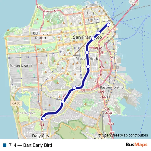 The first stop of the 714 bus route is Daly City Bart Station and the last stop is Transit Center Bay B. 714 (Bart Early Bird) is operational during on weekdays.