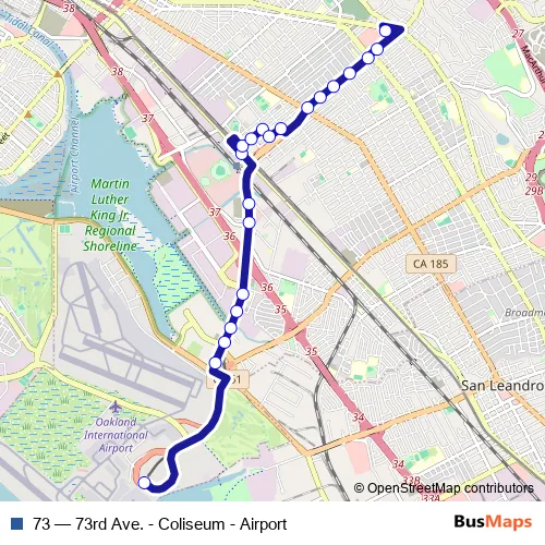 The first stop of the 73 bus route is Oakland International Airport and the last stop is Eastmont Transit Center. 73 (73rd Ave. - Coliseum - Airport) is operational during everyday.