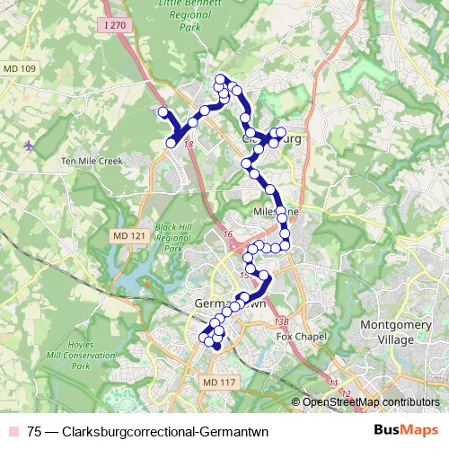 The first stop of the 75 bus route is Whelan LN & @22880 (MC Correctional Facility) and the last stop is Germantown Transit Center & BAY B. 75 (Clarksburgcorrectional-Germantwn) is operational during everyday.