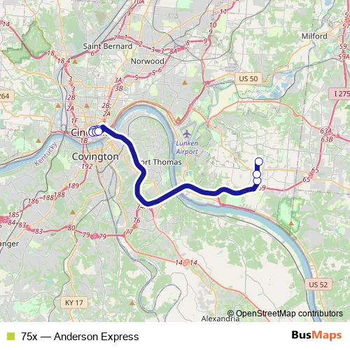 The first stop of the 75x bus route is 6TH ST & Sycamore St and the last stop is Anderson Center DR AT Anderson Station. 75x (Anderson Express) is operational during on weekdays.