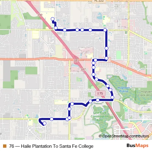 The first stop of the 76 bus route is Westbound SW 87th Dr @ SW 91st St and the last stop is Santa Fe. 76 (Haile Plantation To Santa Fe College) is operational during on weekdays.