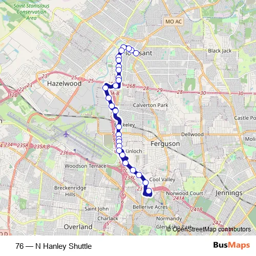 The first stop of the 76 bus route is Saint Francois @ Boone Wb and the last stop is North Hanley Transit Center. 76 (N Hanley Shuttle) is operational during everyday.
