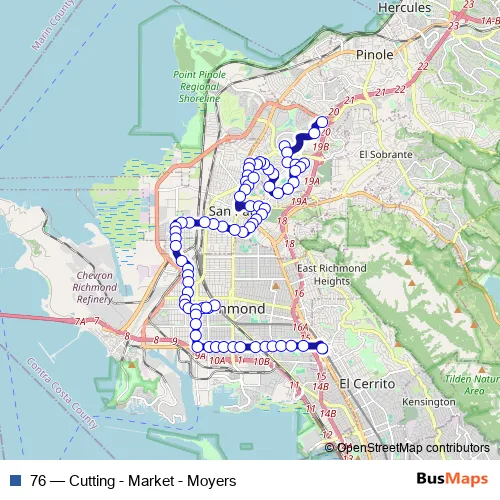 The first stop of the 76 bus route is Richmond Pkwy Transit Center (Park & Ride) and the last stop is Del Norte Bart (Stop B4). 76 (Cutting - Market - Moyers) is operational during everyday.