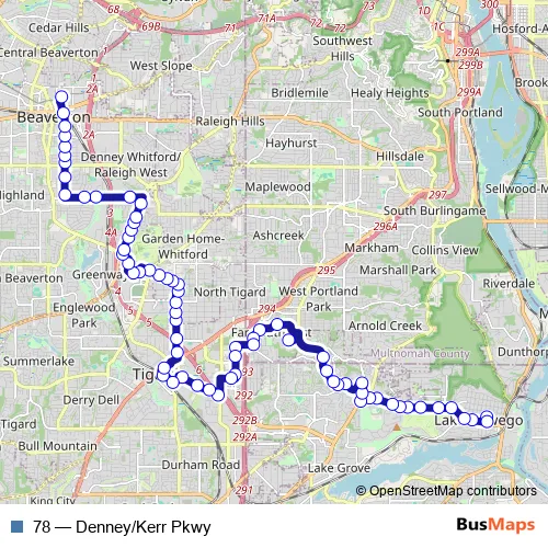 The first stop of the 78 bus route is Lake Oswego Transit Center and the last stop is Beaverton Transit Center. 78 (Denney/Kerr Pkwy) is operational during everyday.