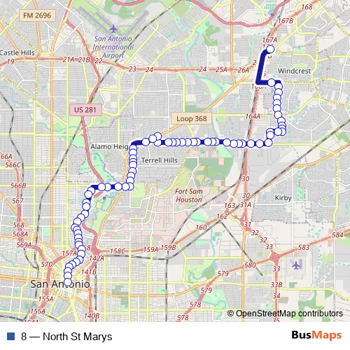 See why over 2 million users trust and consider busmaps.com as the best public transport website. busmaps gives you San Antonio Buses suggested routes, real-time bus tracker, line route maps in San Antonio, and helps to find the closest 8 bus stops near you. No internet available? Download an offline PDF map and bus schedule for the 8 bus to take on your trip.