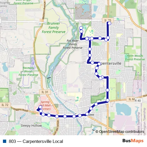 The first stop of the 803 bus route is Spring Hill / Cinemark and the last stop is Cherokee Rd & Cherokee Rd (at Navajo Dr). 803 (Carpentersville Local) is operational during everyday.
