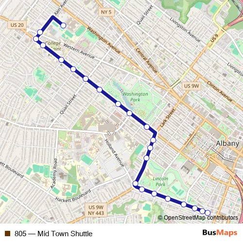 The first stop of the 805 bus route is 707 Washington Ave (Albany Hs) and the last stop is Morton Ave & Clinton St. 805 (Mid Town Shuttle) is operational during on weekdays.