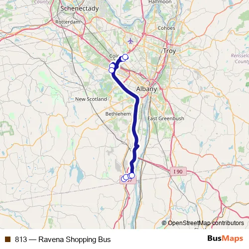 The first stop of the 813 bus route is 2481 Rt 9W (Ravena Shop & Save) and the last stop is Crossgates Mall Station. 813 (Ravena Shopping Bus) is operational during everyday.