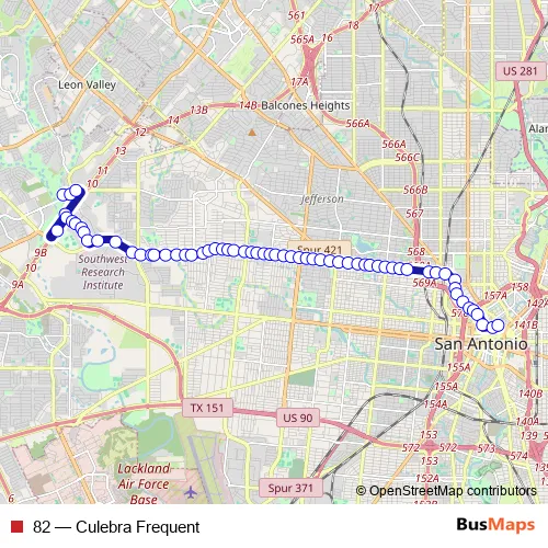 See why over 2 million users trust and consider busmaps.com as the best public transport website. busmaps gives you San Antonio Buses suggested routes, real-time bus tracker, line route maps in San Antonio, and helps to find the closest 82 bus stops near you. No internet available? Download an offline PDF map and bus schedule for the 82 bus to take on your trip.