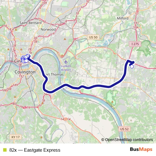 The first stop of the 82x bus route is Union Township P&R - Aicholtz Rd and the last stop is 5TH ST & Sycamore St. 82x (Eastgate Express) is operational during on weekdays.