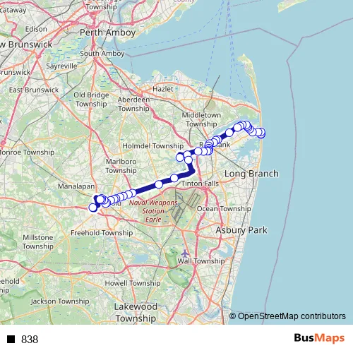 The first stop of the 838 bus route is Ocean AVE AT Church St# and the last stop is Freehold Raceway Mall. 838 is operational during everyday.