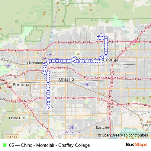 The first stop of the 85 bus route is Chaffey College Transit Center and the last stop is Chino Transit Center. 85 (Chino - Montclair - Chaffey College) is operational during everyday.