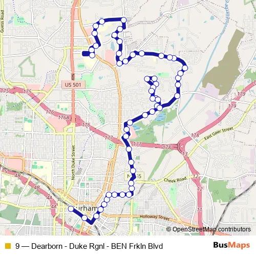 The first stop of the 9 bus route is Durham Station Pettigrew South Platform and the last stop is Duke Regional Hospital (Sb). 9 (Dearborn - Duke Rgnl - BEN Frkln Blvd) is operational during everyday.