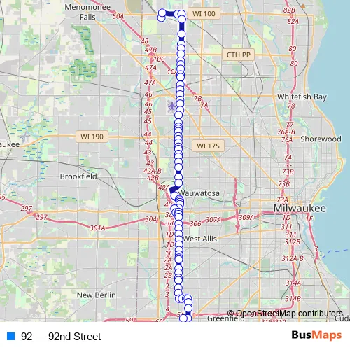 See why over 2 million users trust and consider busmaps.com as the best public transport website. busmaps gives you Milwaukee Buses suggested routes, real-time bus tracker, line route maps in Milwaukee, and helps to find the closest 92 bus stops near you. No internet available? Download an offline PDF map and bus schedule for the 92 bus to take on your trip.