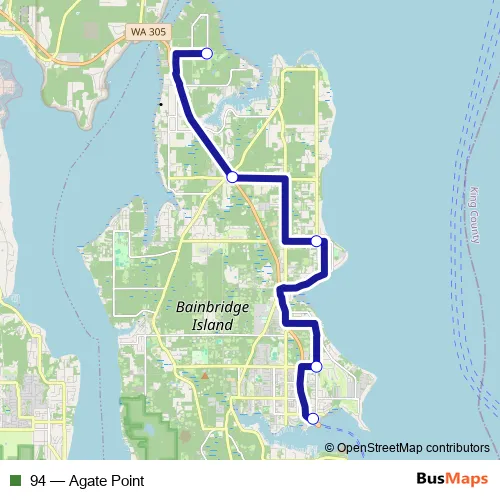 The first stop of the 94 bus route is Bainbridge Island Ferry Terminal and the last stop is Bloedel Reserve. 94 (Agate Point) is operational during on weekdays.