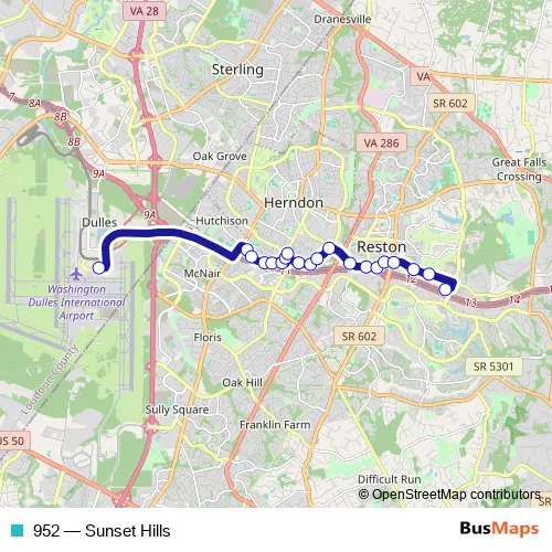 The first stop of the 952 bus route is Dulles Airport and the last stop is Wiehle Metro BAY H. 952 (Sunset Hills) is operational during everyday.