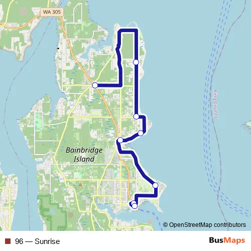 The first stop of the 96 bus route is Day at Phelps (Hwy 305) and the last stop is Bainbridge Island Ferry Terminal. 96 (Sunrise) is operational during on weekdays.