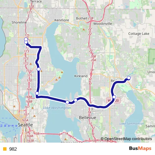 The first stop of the 982 bus route is Bear Creek Park And Ride and the last stop is 1st Ave NE & NE 140th St. 982 is operational during on weekdays.