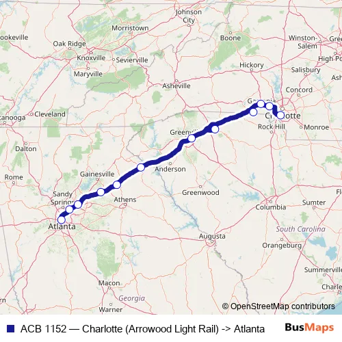 The first stop of the ACB 1152 bus route is Charlotte and the last stop is Atlanta. ACB 1152 (Charlotte (Arrowood Light Rail) -> Atlanta) is operational during everyday.