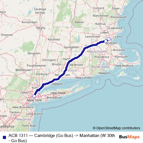 The first stop of the ACB 1311 bus route is Cambridge (Go Bus) and the last stop is Manhattan (Go Bus). ACB 1311 (Cambridge (Go Bus) -> Manhattan (W 30th - Go Bus)) is operational during everyday.