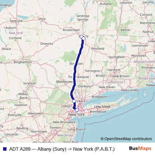 The first stop of the ADT A289 bus route is Albany (Suny) and the last stop is New York (P.A.B.T.). ADT A289 (Albany (Suny) -> New York (P.A.B.T.)) is operational during everyday.