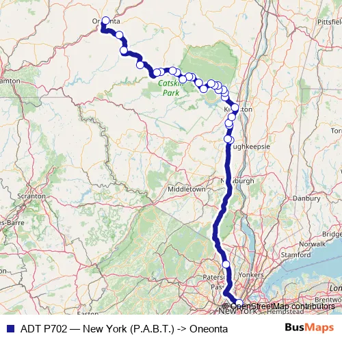 The first stop of the ADT P702 bus route is New York (P.A.B.T.) and the last stop is Oneonta. ADT P702 (New York (P.A.B.T.) -> Oneonta) is operational during on weekends.