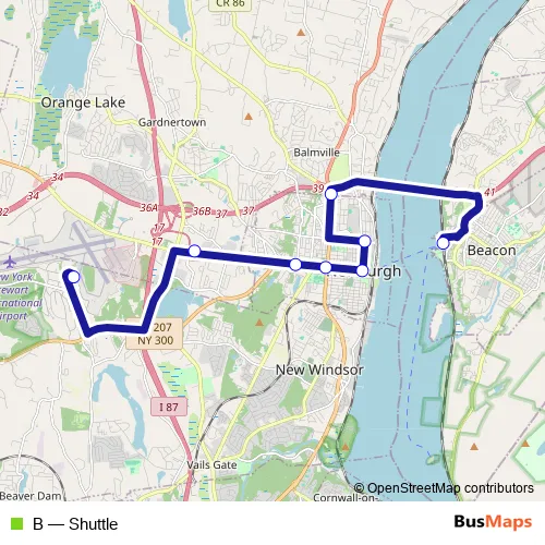 The first stop of the B bus route is Stewart Airport and the last stop is Beacon Station. B (Shuttle) is operational during on weekdays.