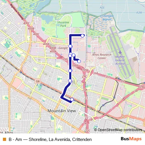 The first stop of the B - Am bus route is Mountain View Transit Center and the last stop is Mountain View Transit Center. B - Am (Shoreline, La Avenida, Crittenden) is operational during on weekdays.