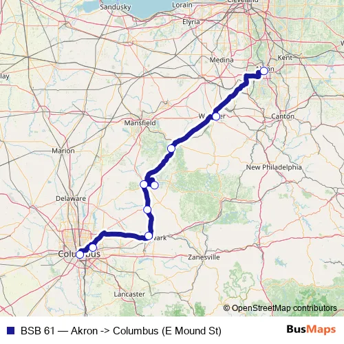 The first stop of the BSB 61 bus route is Akron and the last stop is Columbus (E Mound St). BSB 61 (Akron -> Columbus (E Mound St)) is operational during everyday.