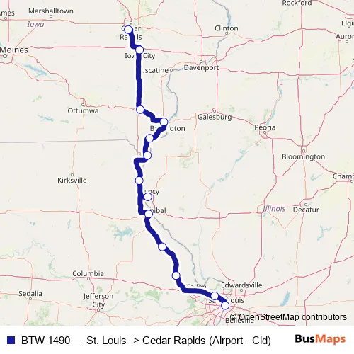The first stop of the BTW 1490 bus route is Saint Louis and the last stop is Cedar Rapids (Airport - Cid). BTW 1490 (St. Louis -> Cedar Rapids (Airport - Cid)) is operational during everyday.