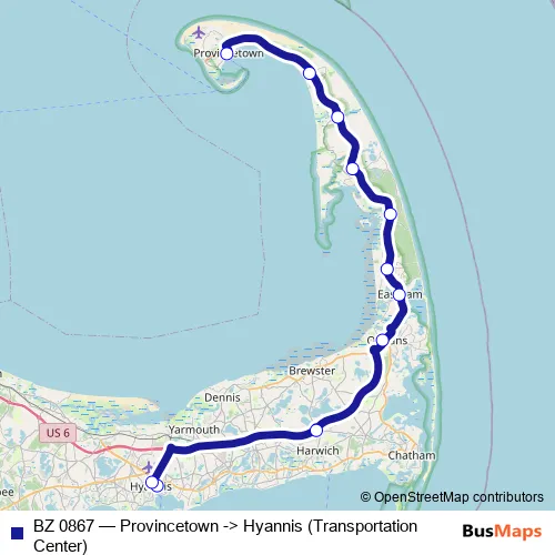 The first stop of the BZ 0867 bus route is Provincetown and the last stop is Hyannis. BZ 0867 (Provincetown -> Hyannis (Transportation Center)) is operational during everyday.