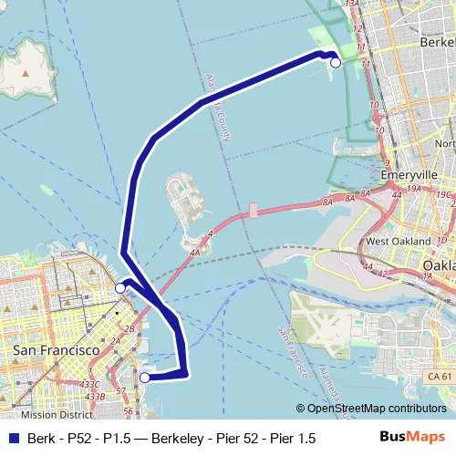 The first stop of the Berk - P52 - P1.5 ferry route is Berkeley Marina, Berkeley Ca and the last stop is San Francisco Pier 1.5. Berk - P52 - P1.5 (Berkeley - Pier 52 - Pier 1.5) is operational during everyday.
