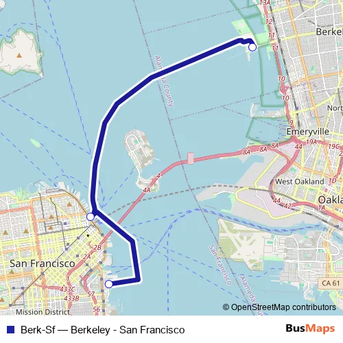 See why over 2 million users trust and consider busmaps.com as the best public transport website. busmaps gives you San Francisco Ferries suggested routes, real-time bus tracker, line route maps in San Francisco, and helps to find the closest Berk-Sf ferry stops near you. No internet available? Download an offline PDF map and bus schedule for the Berk-Sf ferry to take on your trip.